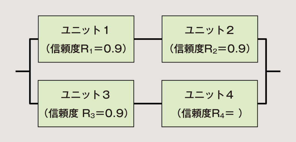 一方、図4の総監試験(R3Ⅰ-1-30)は2つの直列接続ブロックが並列接続になっている。このシステム全体の信頼度を0.9以上とするためには、ユニット4の信頼度R4を、いくつ以上にすべきかという設問である。