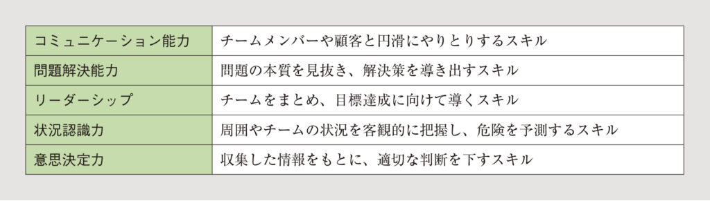 ノンテクニカルスキルは特定の職種や業務に限定されない汎用的な能力のことである。テクニカルスキルを効果的に活用するために必要であり、チームで働くうえで特に重要となる。ヒューマンスキルやソフトスキルとも呼ばれることもある。ノンテクニカルスキルの具体例を表1に示す。