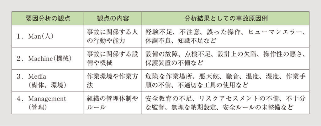 事故の4M要因分析とは事故やトラブルの背景にある原因をMan(人)、Machine(機械)、Media(媒体、環境)、Management(管理)という4つの観点から体系的に分析する手法である。事故の4M要因分析の観点と分析結果例を表2に示す。