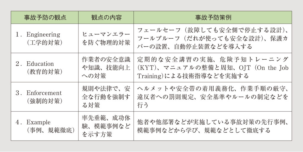 事故の4E対策とは事故を予防するための多角的なアプローチをEducation(教育、訓練)、Engineering(技術、工学)、Enforcement(指導、徹底、強制)、Example(事例、対策、規範)の4つの観点から実施することである。事故の4E対策の観点と、事故予防策例を表3に示す。この4Eは業種や業界によって一部の観点が変わる場合がある。