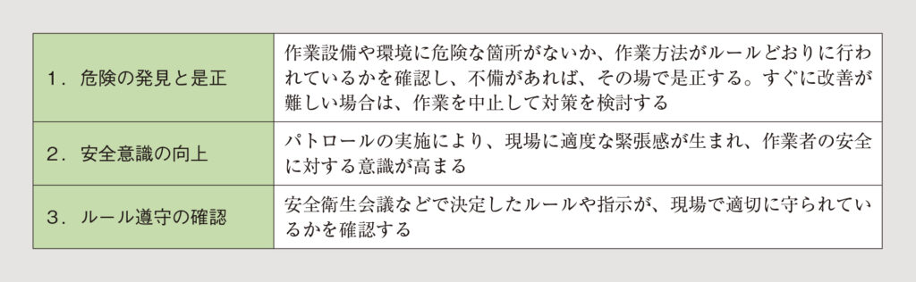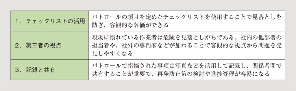 安全衛生パトロールは職場環境や組織体制に起因する根本的な問題を発見するうえで非常に重要な活動である。
