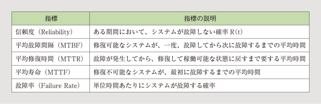 システム信頼度解析の手法として、後述する信頼度ブロック図などがある。信頼度解析で用いる指標を表7に示す。