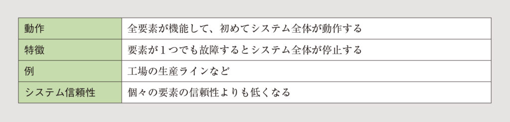 直列システムは、すべての構成要素が一列に接続されているシステムである。直列システムの特徴を表8に示す。