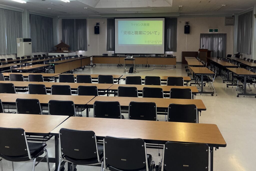 会場は大会議室で、生徒はコの字に着席。ステージは「コ」の開いている部分にありますが、私は生徒たちとコミュニケーションをとりながら進めていくスタイル。そうすると、周りを囲まれる状態です。