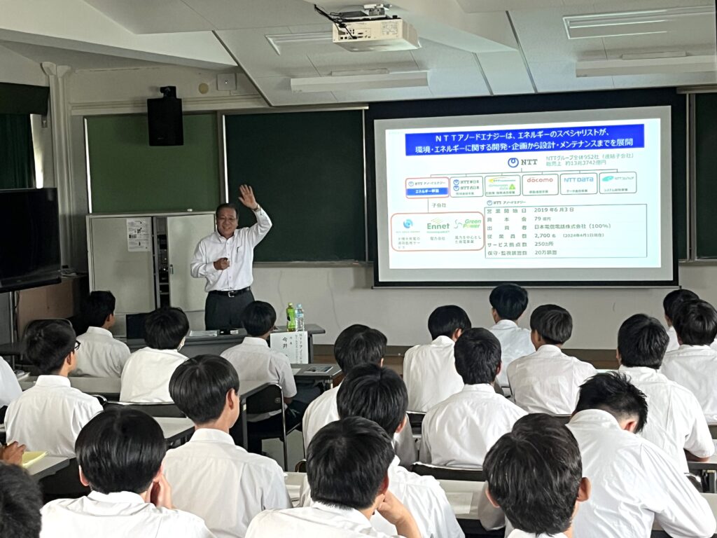 実は、今年の5月に東海地区電気教育研究会(東海4県の電気、電子などの学科を持つ高校の先生たちが研究、連携などを目的とした研究会)を本校で実施したとき、今井次長に講演をお願いしました。東日本大震災のときにNTTアノードエナジー(当時はNTTファシリティーズ)が、どのような対応をしたのかという内容で、自分たちの存在意義、矜持に対するものでした。