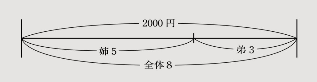(2)2000円を姉と弟で金額の比が5:3になるように分けます。それぞれの金額はいくらになるか求めなさい。