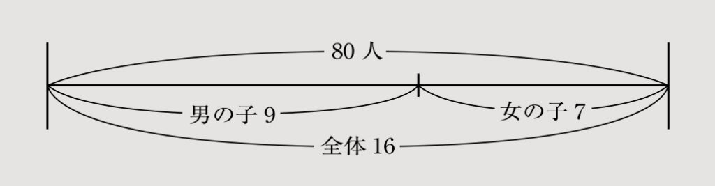 (3)公園で遊んでいる80人の子どもの、男の子と女の子の人数の比は9:7です。男の子と女の子は、それぞれ何人いますか。