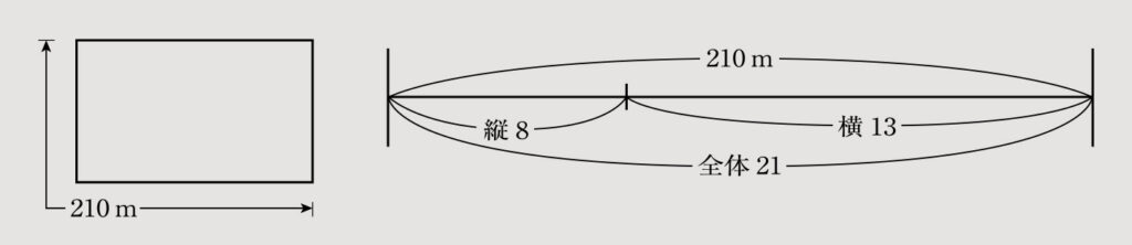 (4)長方形の周りの長さは420mなので、縦と横、それぞれ1辺を足した長さは210mになる。縦と横の比は8:13から、以下のように求められる。