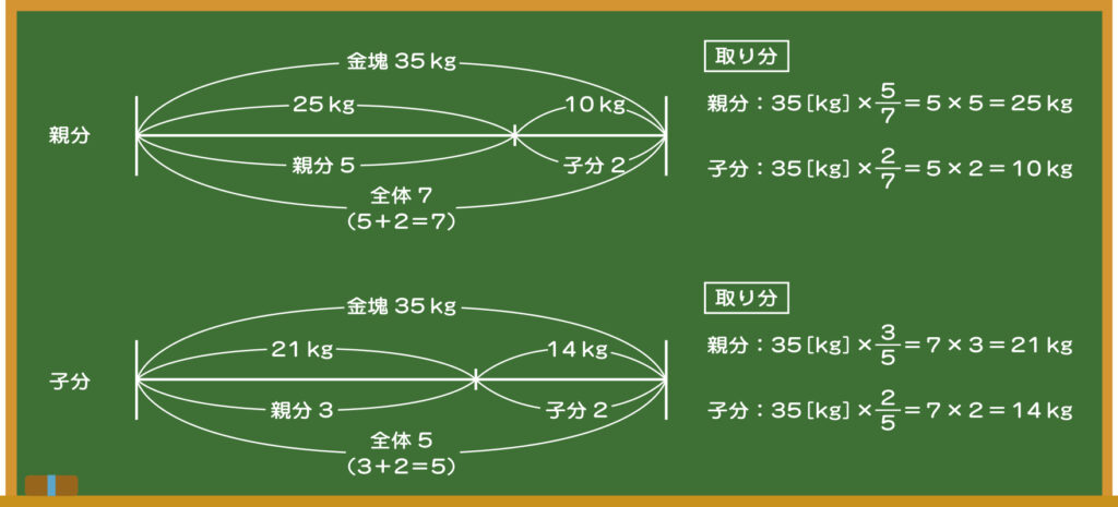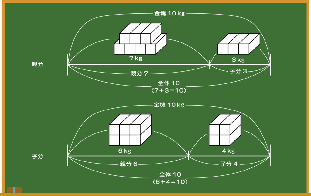 先生 そう、そういうことだ。今回は金塊の取り分について、10kgのときより少し難易度を上げて計算で求めてみようか。まず、黒板の図をみてほしい。親分の場合、全体を7としたとき、取り分は5になる。つまり、