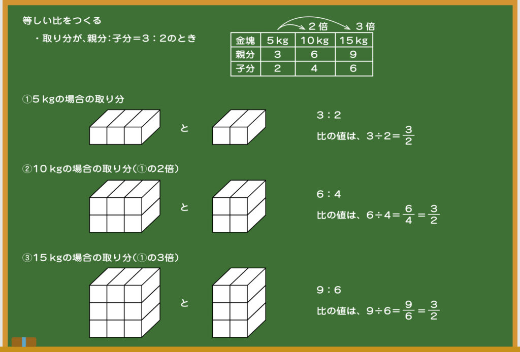 先生 黒板に注目してみよう。①の3:2の場合、②の6:4の場合、③の9:6の場合、どれも比の値は