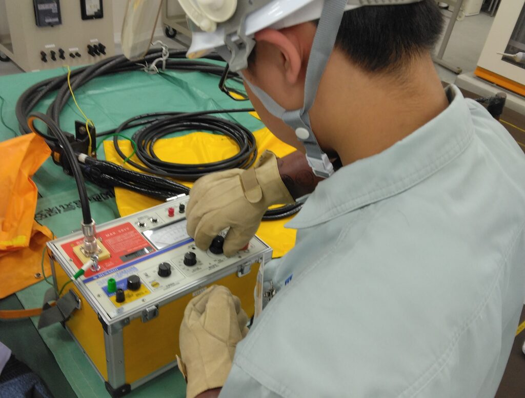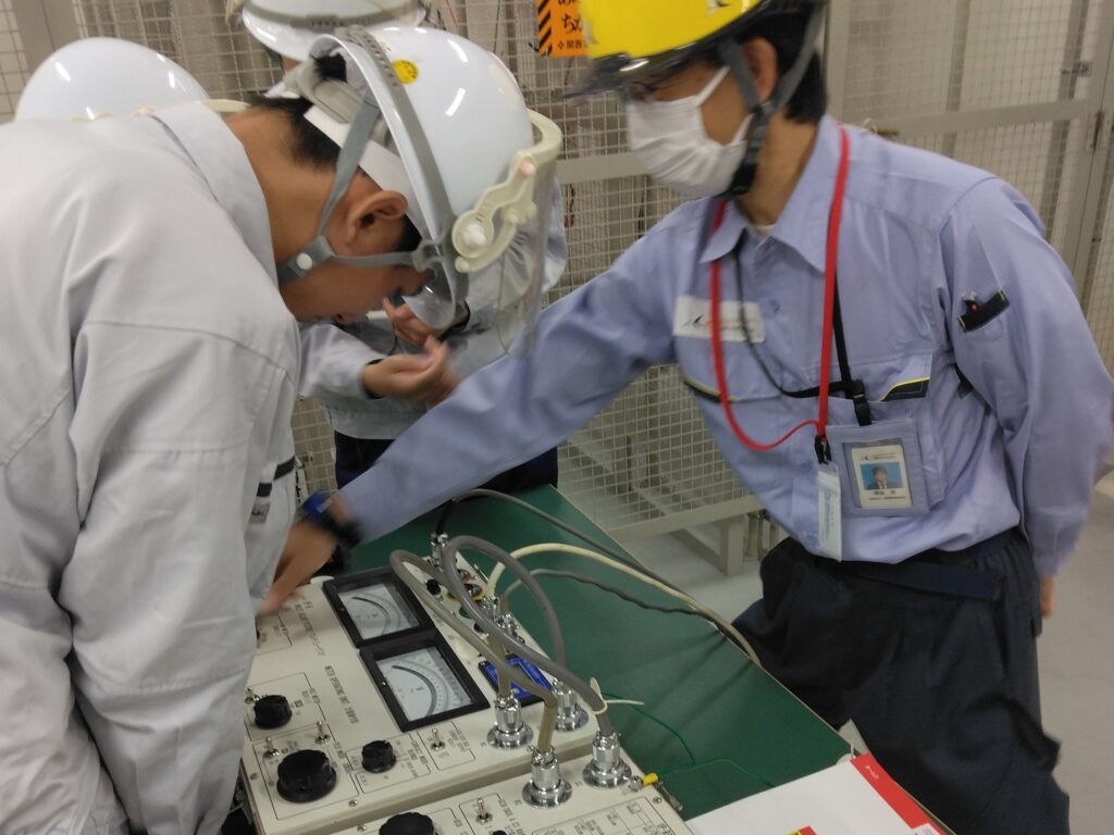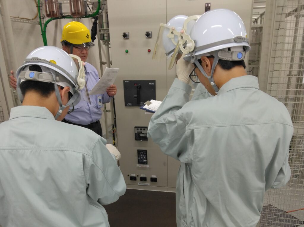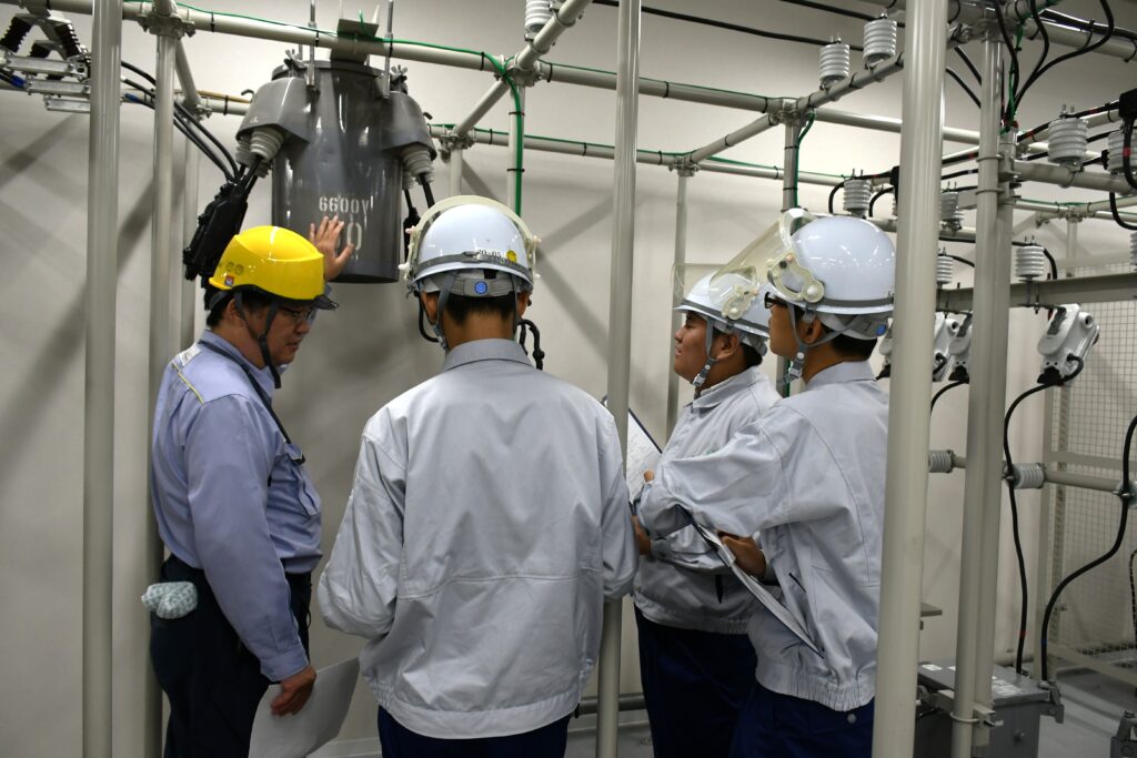3班体制でローテーションしながら受電設備の概要を学び、午前中のプログラムが終了。昼食休憩のあと、電気主任技術者がマスターすべき実務理論「電路の絶縁」「地絡保護」「過電流保護」を座学で解説し、休憩を挟んで、試験業務と測定実務の体験プログラムをこなす。