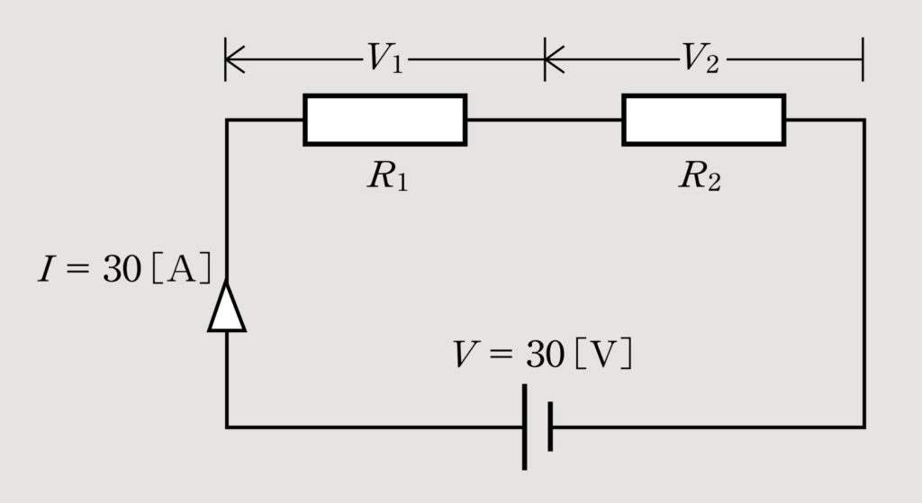 図のような回路がある。この回路の電源電圧Vは30Vで、また、抵抗R1に加わる電圧V1と抵抗R2に加わる電圧V2の比はV1:V2=7:3であった。このとき、電圧V1、V2を求めなさい。