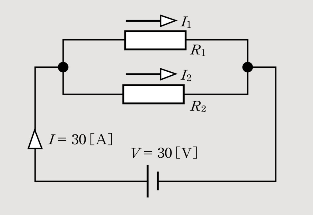 図のような回路がある。この回路全体に流れる電流Iは30Aで、また、抵抗R1に流れる電流I1と抵抗R2に流れる電流I2の比はI1:I2=3:2であった。このとき、電流I1、I2を求めなさい。