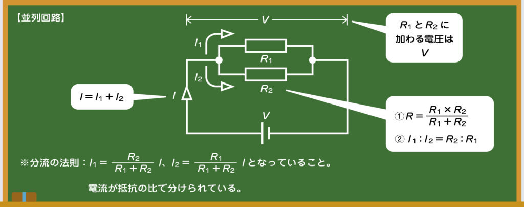 先生 そういうことだ。I=I1+I2が成り立っているよね。これをキルヒホッフの第1法則(電流則)と呼ぶんだ。それぞれの抵抗にかかる電圧と電源電圧は等しくなる。そして、抵抗は……。