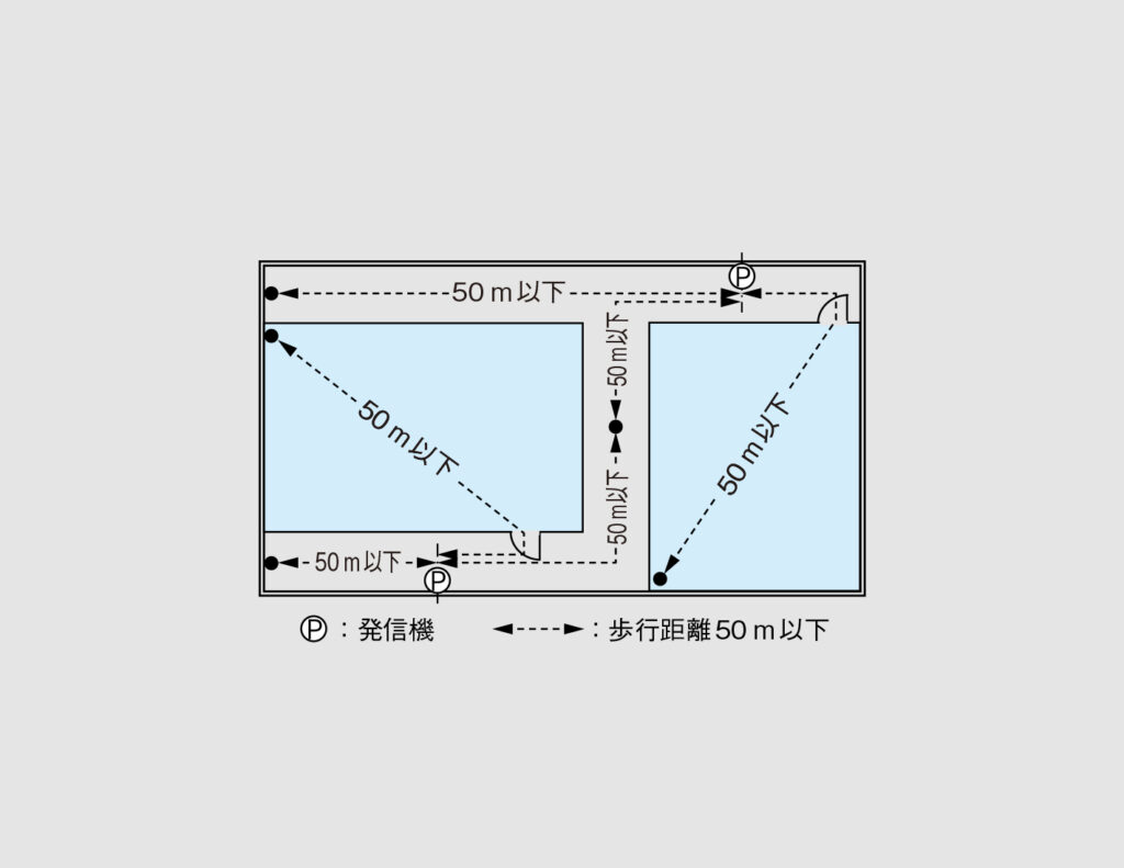 ①発信機は階ごとに、その階の各部分から発信機までの歩行距離が50m以下となるように設置します(図1)。