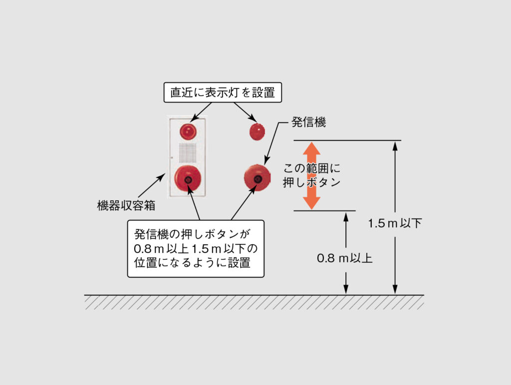 ①:発信機の押しボタンは床面0.8~1.5mの範囲で設置します。よって、正しい。