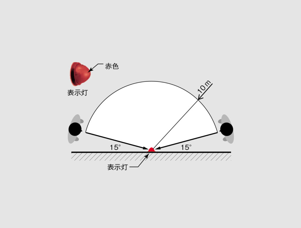 ①表示灯は赤色の灯火とし、取り付け面と15度以上の角度に沿って10m離れた位置から点灯していることが容易に識別できるように設置します(図3)。