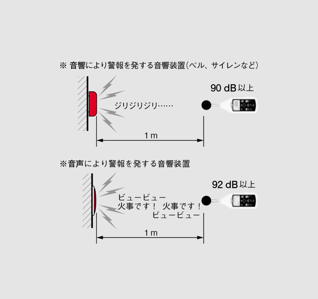 音圧は取り付けられた音響装置の中心から1m離れた位置で90dB以上必要です。なお、音声を発するものにあっては92dB以上の音圧が必要です(図4)。