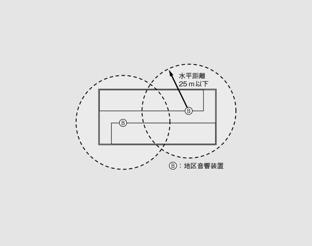 地区音響装置は階ごとに、その階の各部分から1つの地区音響装置までの水平距離が25m以下となるように設置します(図5)。