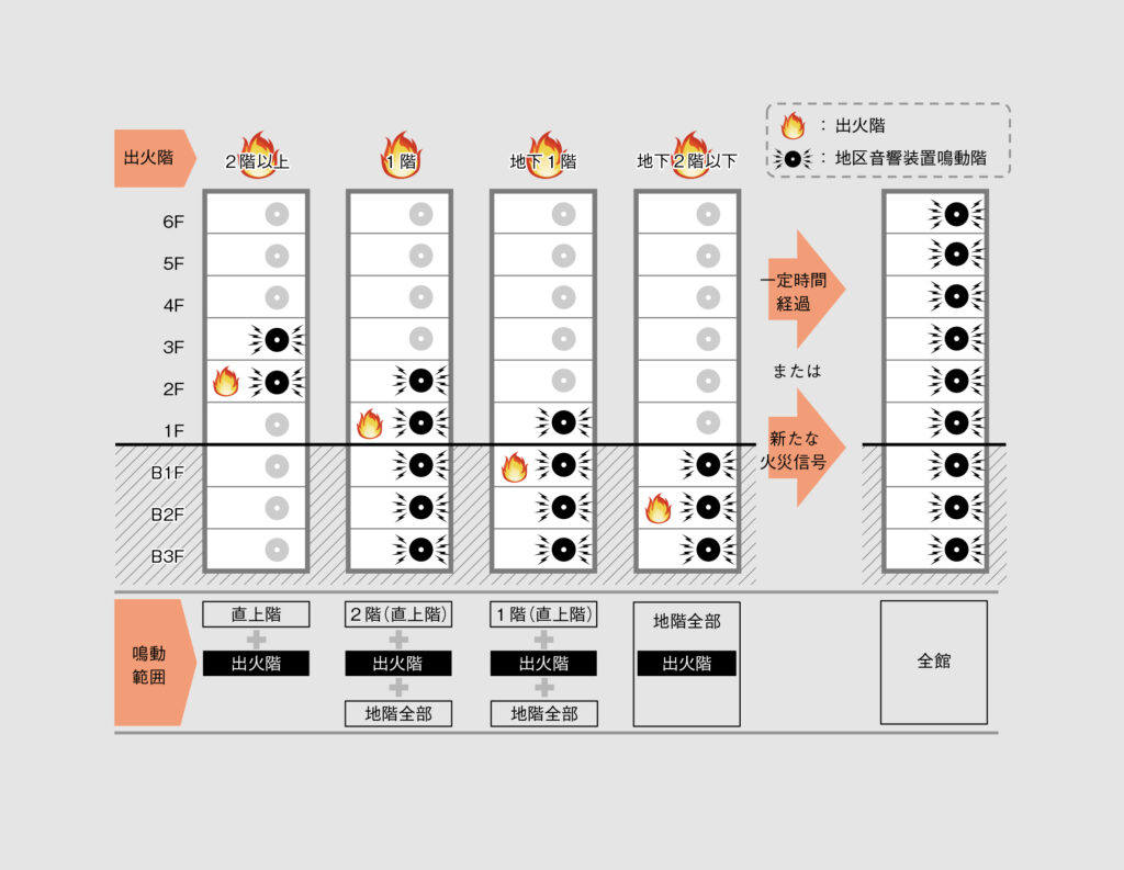 大規模な建物での火災発生時にパニック状態にならないように考えられた方式です。火災時に危険な階を優先して鳴動させます。対象となる大規模な建物は地階を除く階数が5以上、かつ延べ面積が3000m2を超える防火対象物です。