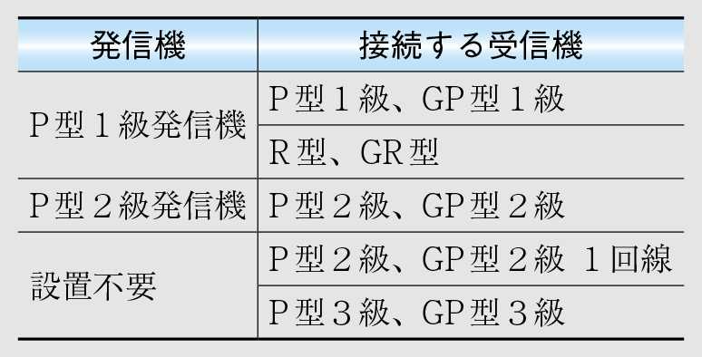 主な発信機にはP型1級、P型2級があります(厳密には、P型1級、2級以外にT型発信機があります。しかし、T型は使用例が少ないことと、試験への出題実績が少ないことから説明を省略します)。この2種類の発信機は、それぞれ接続できる受信機が定められています(表1)。P型1級受信機、GP型1級受信機、R型受信機およびGR型受信機に接続するものはP型1級発信機、P型2級受信機およびGP型2級受信機に接続するものはP型2級発信機です。