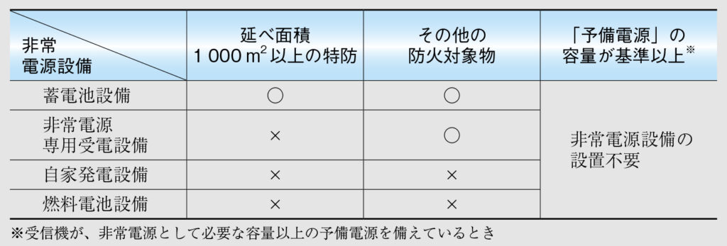 非常電源は常用電源が停止したときに電力を供給します。消防用設備の非常電源としては「非常電源専用受電設備」「自家発電設備」「蓄電池設備」「燃料電池設備」があります。このなかで自動火災報知設備の非常電源として使用できるのは「非常電源専用受電設備」と「蓄電池設備」だけです。さらに、自動火災報知設備の非常電源は以下のように定められています(表2)。