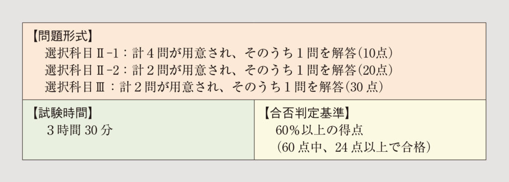 選択科目Ⅱでは、申し込み時に決めた選択科目についての専門知識および応用能力が問われ、Ⅱ-1とⅡ-2の2問を解答します。