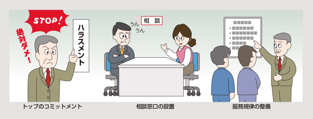 まず、トップが「ハラスメントを許さない」ことをコミットすること。そのうえでハラスメント防止についてルールを作成し、周知、徹底していく。