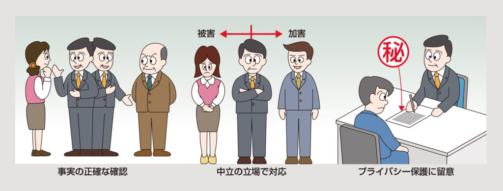 窓口に相談が寄せられたら迅速に調査を開始し、必要な措置を講じる。相談が放置されたり、長引かせたりすると、被害者は会社に対する不信感が生じ、事態の解決が困難になるからだ。