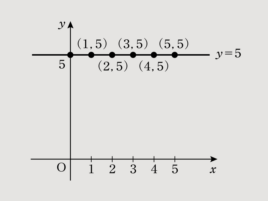生徒 x=1のときは「y=0×1+5、y=5」で、x=2のときは「y=0×2+5、y=5」で…… あっ、傾きが0だからxの値とは無関係にy=5になります!
