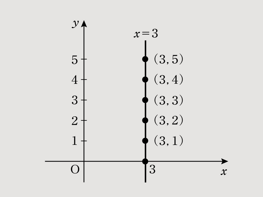 先生 同じように、x=cのグラフを考えてみようか。一次関数をay+bx=cと表すこともあって、a=0、b=1を代入したときのグラフがx=cだ。例えばx=3とすると、どんなグラフが描ける?