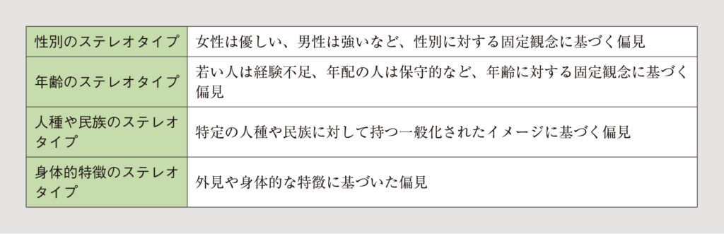 アンコンシャス・バイアスの種類を表1に示す。ステレオタイプとは、特定属性を持つ人々や集団に対して、画一的で固定的なイメージを持つことである。ここで登場する「人種」という言葉は一般的に用いられているが、科学的には、人類はホモ・サピエンス(Homo sapiens、現生人類)という1つの種である。