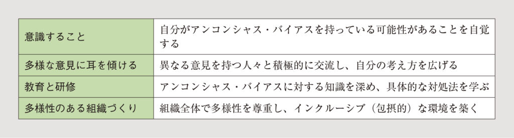 アンコンシャス・バイアスは、誰もが持っている可能性がある無意識の心のクセである。これを克服して、さまざまな違いを持つ人々が共存し、互いを尊重する。その能力を最大限に生かせる職場や社会を実現するためには、ダイバーシティ・マネジメント(多様性尊重の戦略、取り組み)が重要である。それを実現した組織や社会をインクルージョン(inclusion、包摂、包括)の状態という。