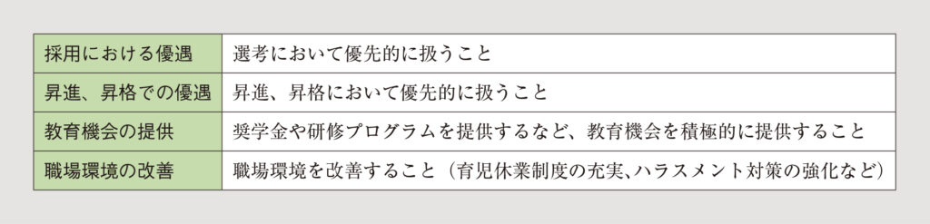 採用、職場環境や教育環境におけるポジティブアクション推進の具体例を表5に示す。