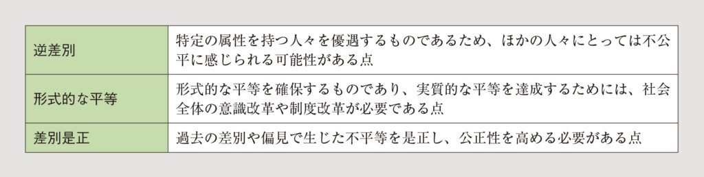 ポジティブアクションは社会の多様性を尊重し、すべての人々が公平な機会を得られるようにするための重要な取り組みであるが、その実施には多様な課題や注意点があることも事実である。