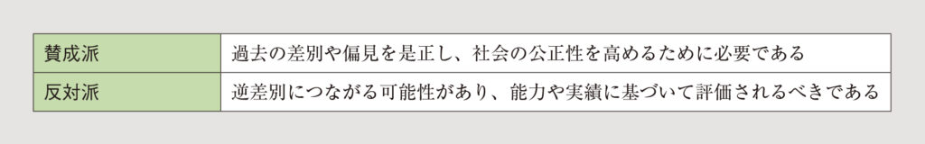 ポジティブアクションの推進には賛成派、反対派、そのどちらでもない人々がいる。表7に両派の代表的な意見を示す。