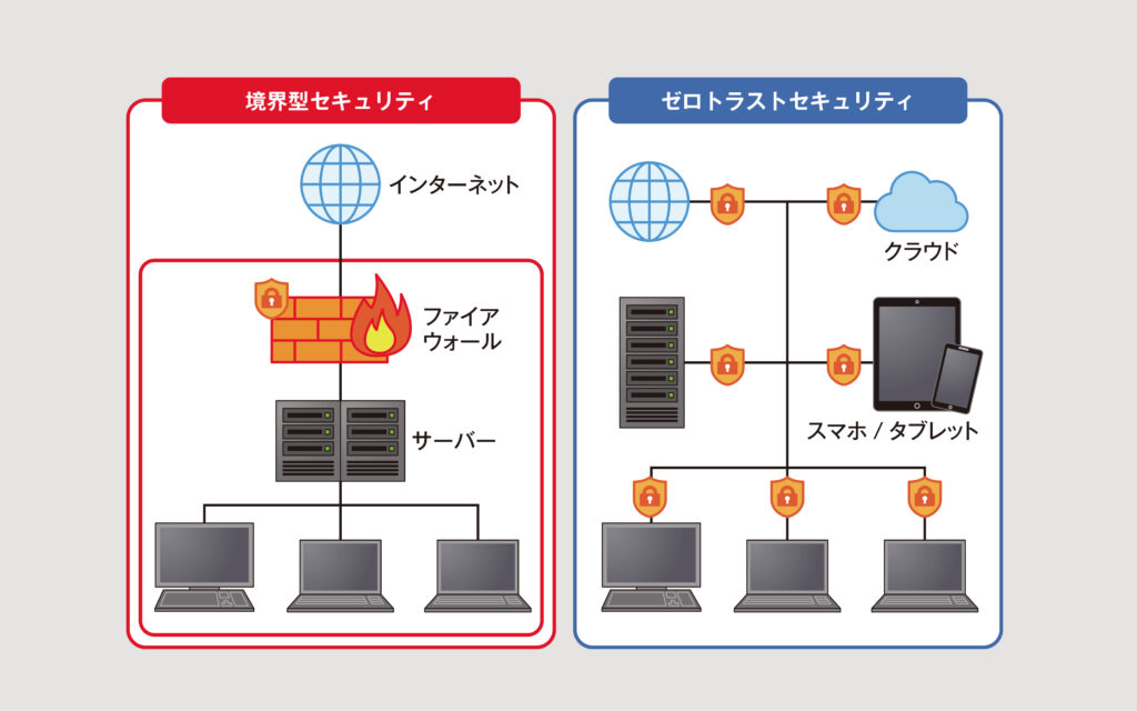 ゼロトラストセキュリティは社内を含むネットワーク上の全デバイスやユーザーを信頼せず、常に身元を確認し、アクセス権限を細かく制御するセキュリティモデルである。