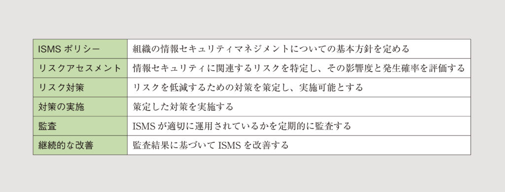 ISMS(Information Security Management System)とは、組織の情報資産を保護するための体系的な取り組みを指す。具体的には情報セキュリティに関連するリスクを特定し、そのリスクを低減するための対策を計画、実施、評価、改善する一連の活動のことである。
