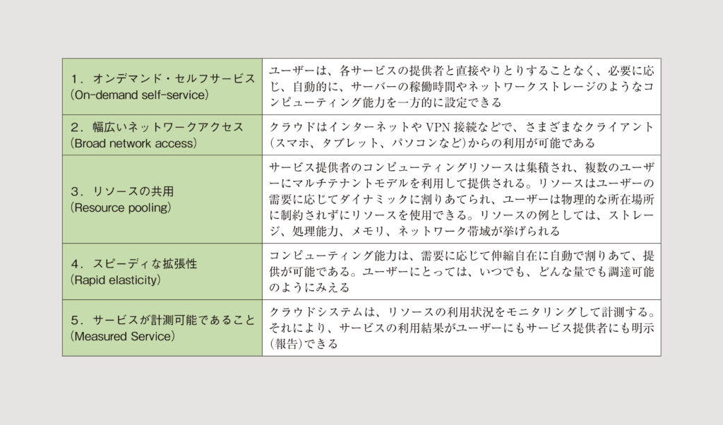 クラウドコンピューティングは表9のように5つの特徴を備えている。