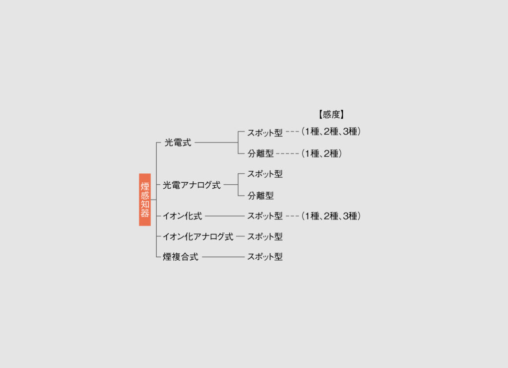スポット型は検知方式の違いで「光電式スポット型感知器」と「イオン化式スポット型感知器」があり、分離型は光電式分離型感知器があります。これらは感度により1種から3種(分離型は1種と2種)まで区分され、感度の高い順に1種、2種、3種となっています(図1)。