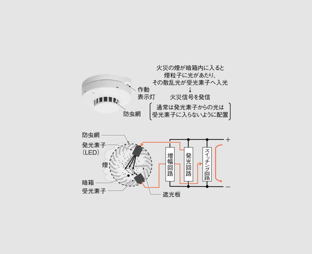周囲の光は遮断し、煙は流入できるようにした暗箱に、発光素子と受光素子を異なる角度で配置。さらに、遮光板を設置することで、通常は発光素子からの光が受光素子に入らないように構成されています。
