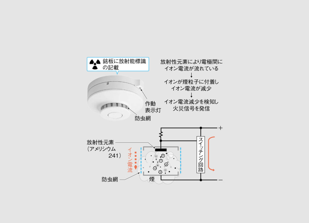 イオン化式スポット型感知器については、イオン化に放射性物質を使用しています。環境意識の高まりで、最近では使用が減少しています。
