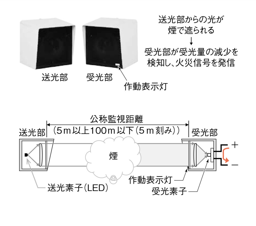 光電式分離型感知器は周囲の煙濃度が一定の値以上になったときに火災信号を発信するものです。一定距離間に光を発する送光部と、送光部から発せられた光を受ける受光部を分離して設置し、火災時に発生する煙により受光部の受光量の変化を検出して火災信号を発信します(図4)。