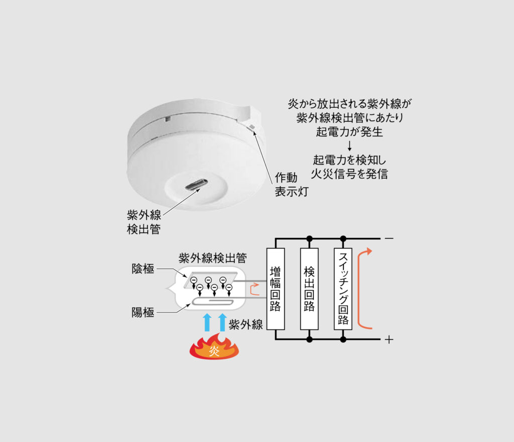 紫外線式スポット型感知器は火災の炎から放射される紫外線を検出します。紫外線による受光量の変化が一定以上になったとき、火災信号を発信します(図6)。