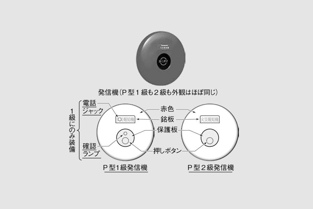 P型1級発信機はP型1級受信機およびR型受信機に接続して使用します。P型2級発信機はP型2級受信機に接続して使用します。いずれも押しボタンを押すことで火災信号を発信します。