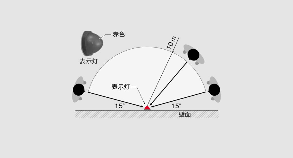 (ハ)取りつけ面と15°以上の角度となる方向に沿って、10m離れたところから点灯していることが容易に識別できるものであること(図9)
