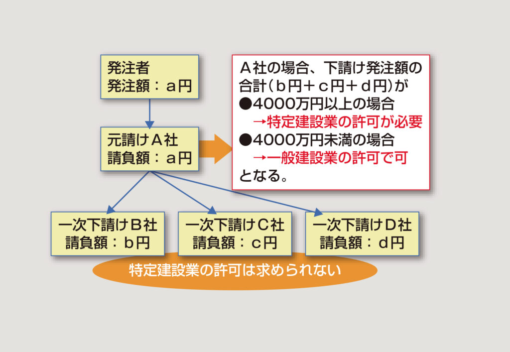 例えば、図1のような発注体系の場合、元請けであるA社の下請け発注金額b円+c円+d円が4000万円以上の場合は特定建設業の許可が必要。それ未満の場合は一般建設業の許可となる。なお、下請けであるB社、C社、D社も一般建設業の許可でいい。