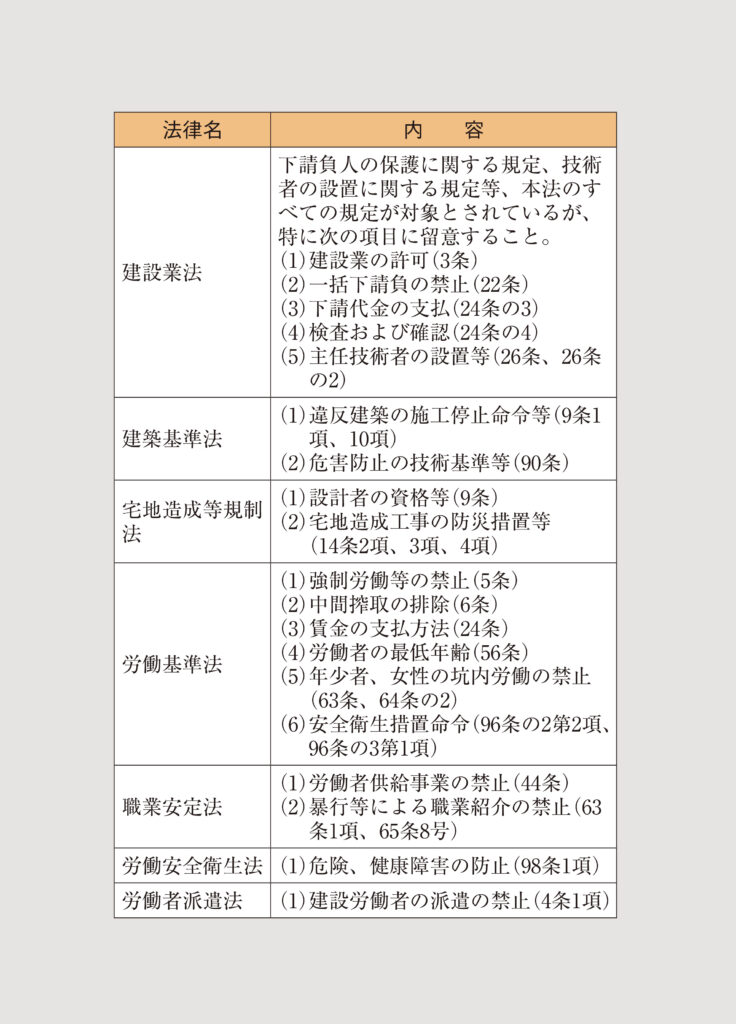 特定建設業者が指導すべき法令を表1に示す。
