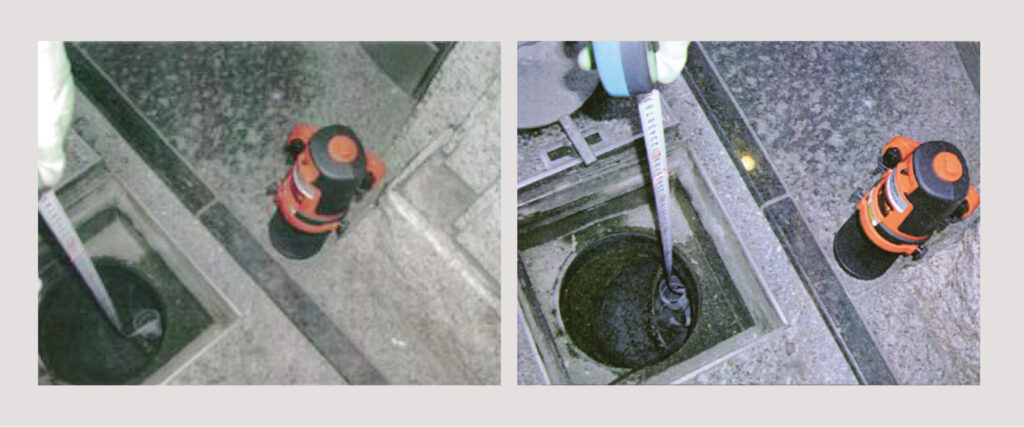 レーザー水平器をセットして基準高さからコンベックスで各小口径マスの管底深さを記録し、順次レベル差を割り出しました(図1、写真2)。その結果、一部で陥没などによる逆勾配での水たまりがあるものの、全体では1/200の順勾配であることを確認しました。