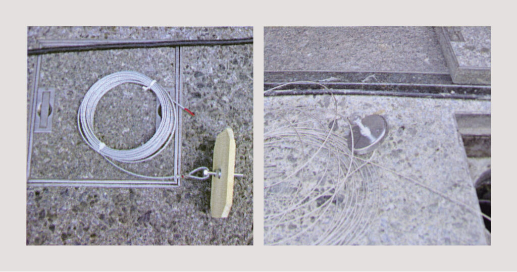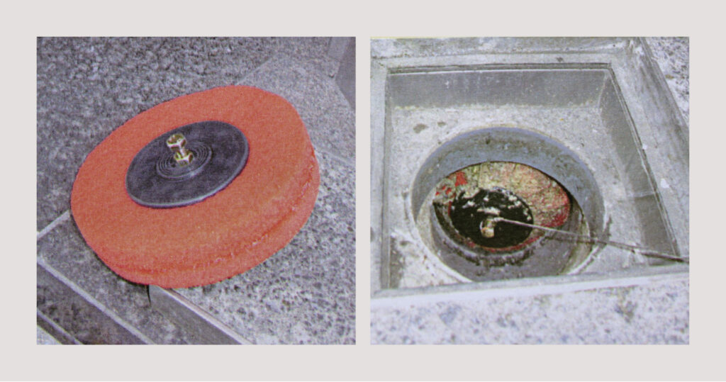 煙突清掃の応用で、床掃除用のナイロンパッドを円形鉄板で挟み、両端にステンレスワイヤー(配管内への引き込みにはスネークワイヤーとの併用を推奨)を10m取りつけ、水上のマスと水下のマスの両方からワイヤーを綱引きして配管内の汚れをかき出します(写真3)。